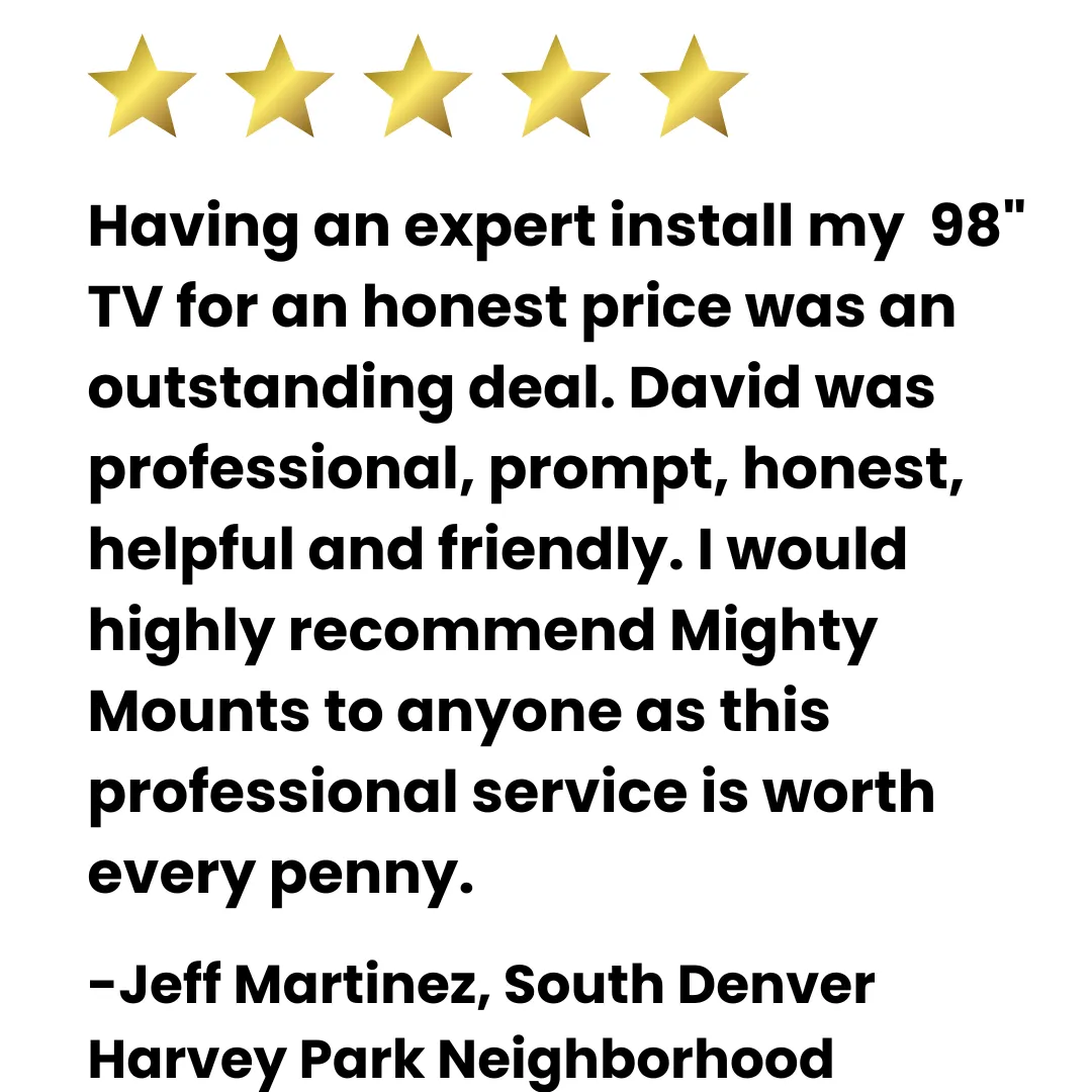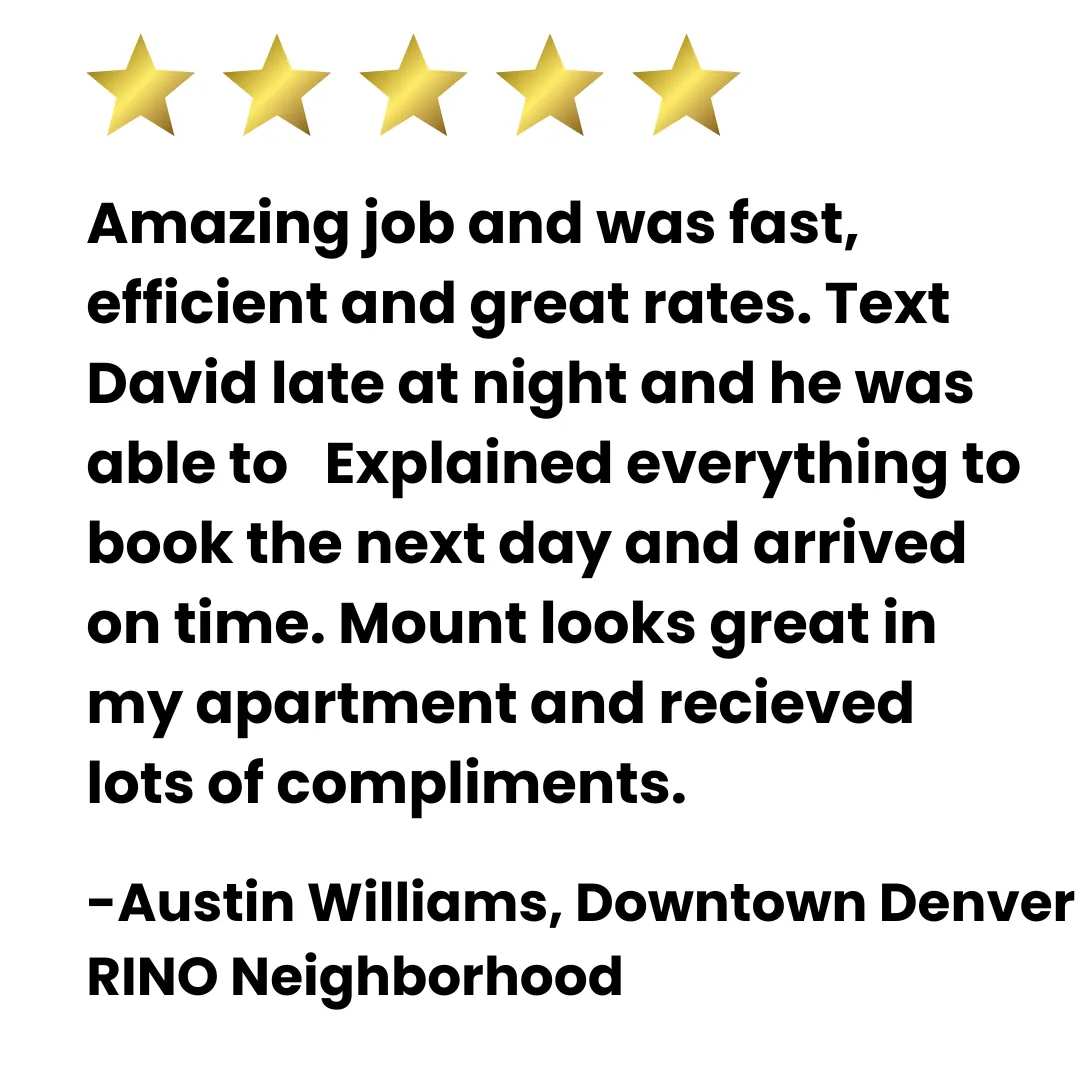 At Mighty Mounts, we believe top-tier service shouldn't come at a top-shelf price tag. We're proud to be the go-to mounting experts for homeowners & businesses in the Metro Denver area who value: